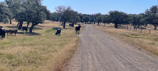 Parque Nacional de Monfragüe is a surprise with large areas of water in an otherwise dry landscape. It is rugged landscape and mountaunous in part but supporting much wildlife. Bonelli's eagles plainly visible swooping down from graggy outcrops above the waterways and other birds of prey I couldn't recognise. Cattle, donkeys and wild deer. Encimas and Alconoques are 'oak' species trees suited to the dry climate and cover the landscape entirely. The fruit acorn is used to feed pigs which I didn't see!